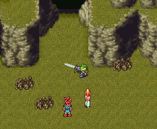 Хроно вонзает меч в землю напротив. Лягуш бросает взгляд на оружие героя, а затем, будто став выше ростом, по-лягушачьи хохочет и громко провозглашает: