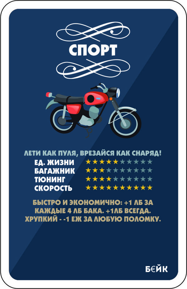 В колоде авто были мотоциклы и автомобили. У каждого транспорта были (на тот момент) 3 свойства - единицы жизни, тюнинг и багажник. Единицы жизни - думаю тут все понятно, терялись за определенные события и поломки, как доходило до нуля - геймовер, начинай сначала. Тюнинг - сколько улучшений можно поставить на машину (изначально все эти индикаторы были сделаны звездочками, но глазам было больно их считать), багажник - сколько карт ты можешь держать на руках.