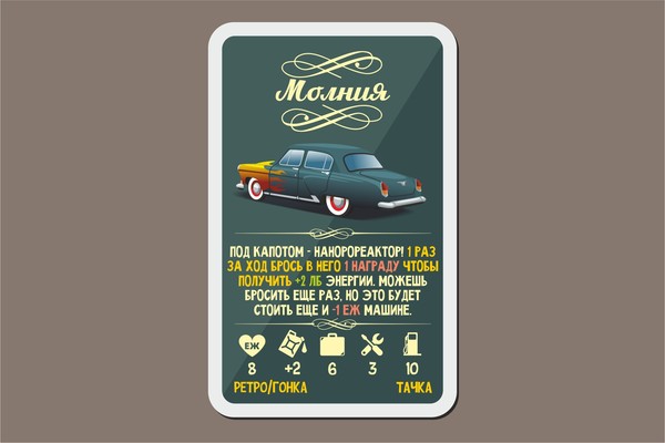 Доброго времени суток, уважаемые читатели (которых еще нет)! Начнем издалека... Так уж получилось, что моя жизнь неразлучно связана с ретро-машинами, более того, я активно продвигаю эту движуху у нас в регионе (Тюмень), являясь президентом единственного клуба таких же как я "олдскульщиков" (а еще волгавод, рокабил, бриолинщик и много других страшных слов) :) Так вот, любой знакомый с жизнью ретровода человек знает, что мы - народ в чем-то похожий на байкеров, ибо так же безумно любим своих железных коней, а поэтому зимой впадаем в глубокую спячку. Чем заняться зимой, если нет возможности собраться и покататься? Со своими "нормальными" (не ретронутыми) друзьями мы периодически собирались и рубались в веселые настолки вроде "Манчкина". И вот на этой почве мне в голову ударила (сильно) мысль - а что если сделать настольную игру, с блэкджеком и ш... с ретро-машинами, ретроводческими приколами и иными приятными сердцу моментами, снабдить возможностью мешать друг другу, используя разные грязные приемчики, дабы получить победу в соревновании. В голове сразу же начал вспыхивать миллион мыслей, нарисовалась механика (которая прошла длинный эволюционный путь), в общем, энтузиазм переполнял и я сел ваять. Т.к. работаю в рекламе дизайнером - навыки для этого имелись. Для уменьшения цены (ни о каком издании пока речи и не шло) было решено карты делать под вырубную форму пластиковых карт, в целом - очень хороший формат, т.к. и текст читается, и места на столе занимает не так много. Так за пару недель родилась версия (ну пусть будет условно 0.1) настольной игры, рассчитаной на 2-6 игроков, этакая смесь Манчкина с передвижением по карте и... да не знаю с чем :) В игре собрано безумное множество водительских мифов и страхов, разнообразных клише, в общем несерьезно и с юмором. Большой плюс - в нее не надо долго вникать, она понравится даже тем, кто совершенно не знаком с настольными играми.