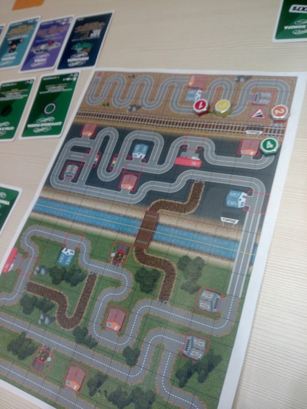 Так же были различные мелочи, вроде уклона дороги (проезжаешь дальше или ближе, в зависимости от того, к чему (куда) клонишь :) ), ограничение скорости (клеток за ход), сплошная линия, где нельзя обогнать соперника и бездорожье, по которому могли проехать внедорожники (остальные там получали штраф).