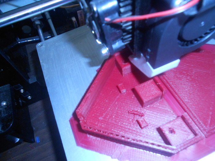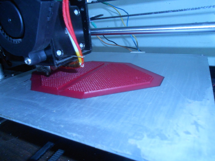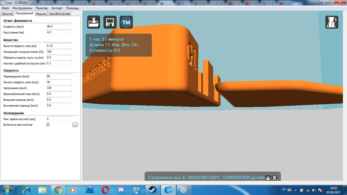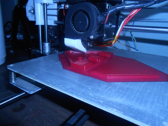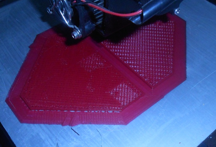 Я напечатал соплом 0,5мм, пластик вишнёвый ABS. Скорость печати - 80мм\с, плотность заполнения 25%, температура сопла 240 градусов, температура стола 95 градусов, тип поддержки - кайма, Толщина низ\верх - 0.5мм, толщина стенок - 1мм, толщина слоя 0.25мм. Скорость заполнения - 100мм\с. Скорость печати первых слоёв - 40мм\с. Скорость перемещения 80мм\с