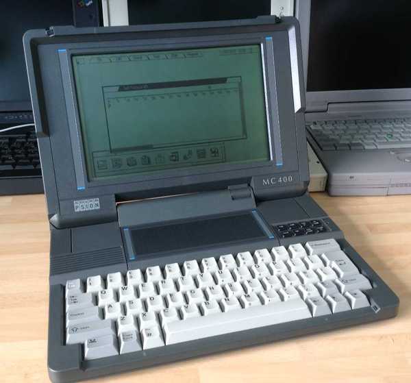 Оригинальное изделие вышло из стен Psion в 1989 году. Модель MC 400, по размерам сопоставимая с современными ноутбуками, была настоящим прорывом. Целых 256 Кб RAM, два слота для периферийных устройств, четыре фирменных разъема SSD для подключения внешней памяти с возможностью горячей замены, аппаратный модуль компрессии голоса (диктофон) — 8 минут записи сжимались в 64 Кб! Вопрос с электропитанием был решен с запасом: можно было пользоваться как аккумулятором, так и батарейками формата AA (8 штук).