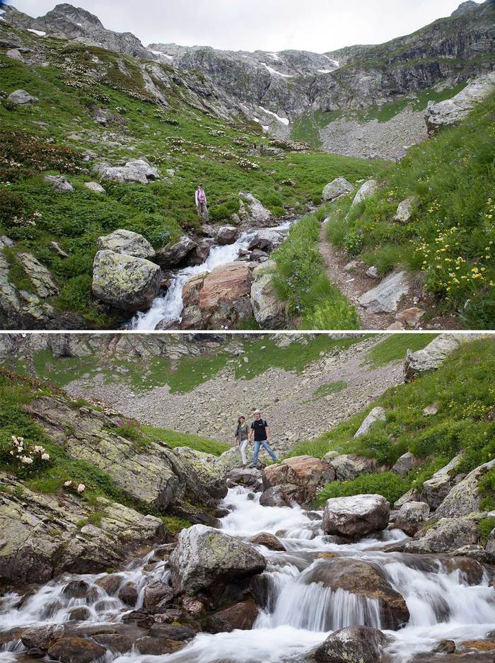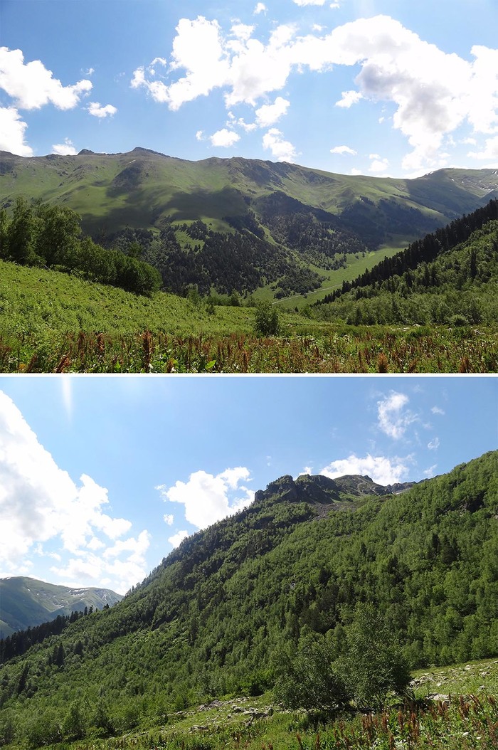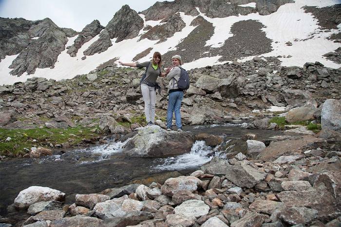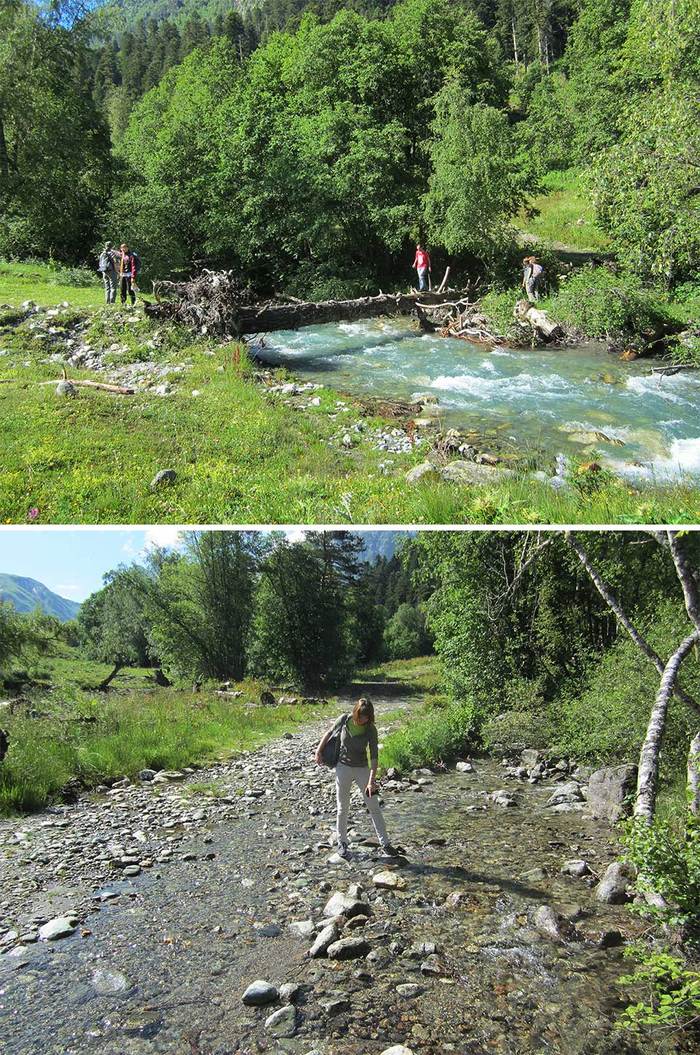 И вот, мы на месте. Потрусило нас изрядно, и снова стать ногами на земную твердь ой, как приятно) Начали без раскачки — сначала по бревну через реку, потом вообще по камням вброд. Препятствия вроде бы несерьезные, но оступиться здесь и идти дальше с мокрыми ногами, конечно же, не хотелось. Дальше горные речушки не раз преграждали нам путь. А пока останавливаемся, мажемся с ног до головы кремом от загара и выдвигаемся. Еще у подножия горы мы разделились на две группы, и чтобы не быть балластом для "скороходов", которые подготовлены гораздо лучше нас, пошли не спеша следом. Разумеется, в сопровождении проводника, чьи обязанности в этот день предстояло взять на себя милой и обаятельной сотруднице САО-Екатерине.