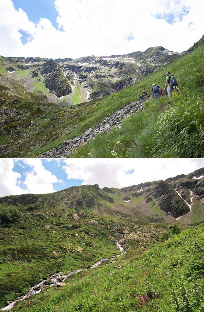 Первая наша цель - озеро Айматлы-Джагалы, находится на высоте 2400 метров. Путь к нему пролегает через альпийские луга, которые предстояло пройти под палящим солнцем. Мысленно похвалили себя за то, что не поленились обмазаться кремом и надели головные уборы, которые здесь не то что желательны - обязательны! Много описывать подъем не стану по двум причинам: 1) лучше смотреть фотографии, чем читать о том, как нам было тяжко;