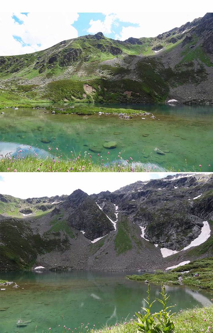 Спустя 2 часа мы достигли, наконец, первого озера. Пока шли лугами были мысли искупаться в нем, но по прибытию сил для водных процедур не осталось. Да и солнце спряталось за облаками. Когда прибыли на Айматлы первая группа уже собиралась, а мы только располагались для отдыха. Очень хотелось пить, т.к. во время подъема не делали ни глотка. Жажду утолили водой из ручья, впадающего в озеро, и чаем из трав, который предусмотрительно заварили еще в гостинице.