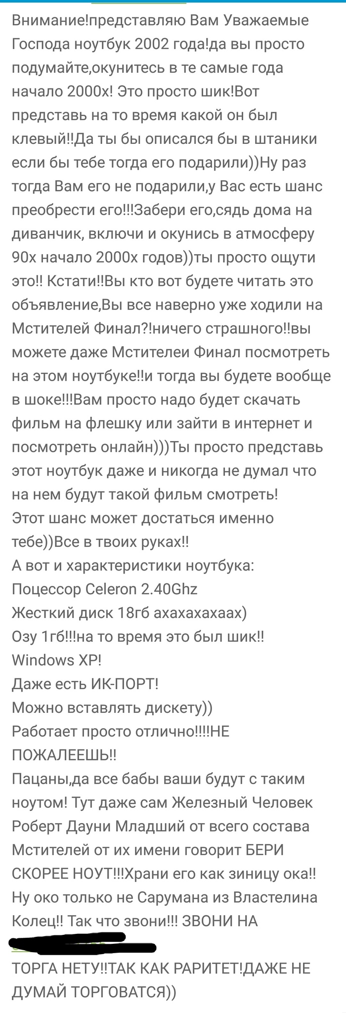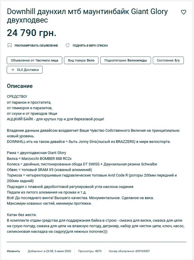 Вот на такое объявление я сегодня наткнулся на украинской торговой площадке ОЛХ