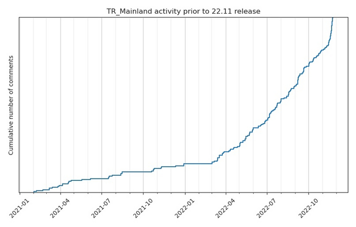 График, показывающий ускорение темпов редактирования материка вплоть до выхода Dominions and Embers.