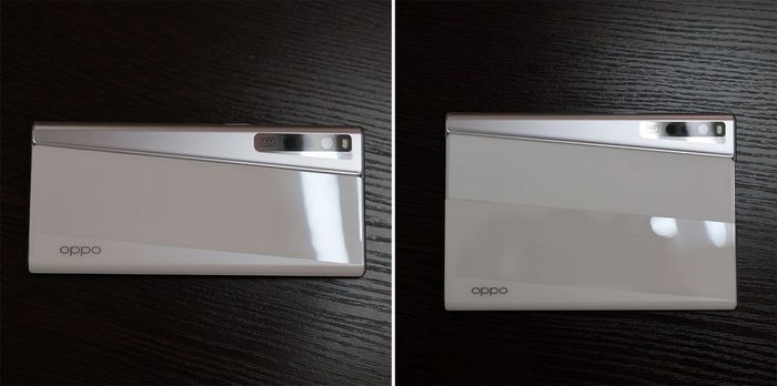 В сложенном состоянии OPPO X 2021 не отличается от любого современного смартфона. Это монолитный продолговатый брусок без единого намёка на свою главную фишку. Но если дважды нажать на кнопку включения или свайпнуть по ней вверх, начинается магия: корпус самостоятельно расширяется. Выглядит это ещё круче, чем сгибаемые пополам устройства. Свайпом вниз аппарат неспешно сжимается.