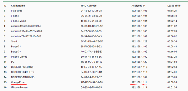 Находим клиента OrangePiZero и смотрим его Ip (192.168.1.111)