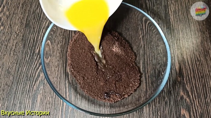 4) Масло сливочное растапливаю на водяной бане и добавляю в крошку печенью. Перемешиваю до однородности.