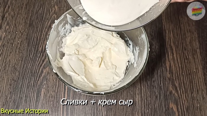 10) Соединяю сливки и крем сыр. Перемешиваю до однородности.