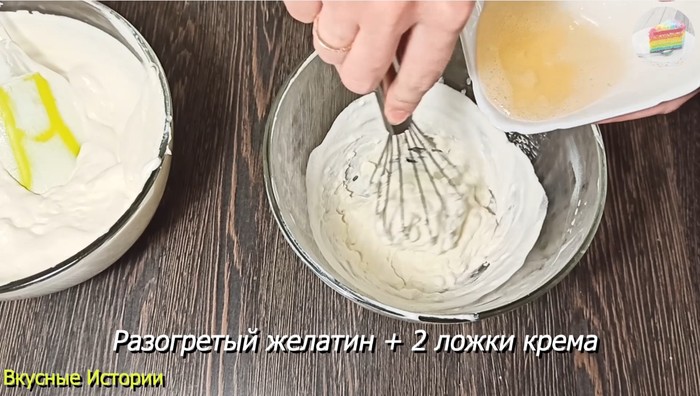 11) Разогреваю желатин и соединяю его с 2-мя ложками крема. Соединяю с кремом и быстро перемешиваю миксером до однородности 20-30 сек. Не взбивать!