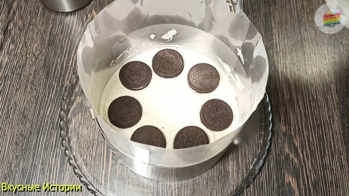 13) Поверх выкладываю печенье ОREO. Далее выкладываю вторую половину крема и выравниваю поверхность чизкейка.