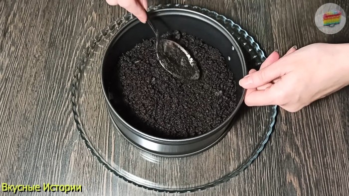 5) Использую форму диаметром 18 см. Высыпаю печенье и плотно трамбую на дно разъемной формы. Отправляю в холодильник на 20 мин.