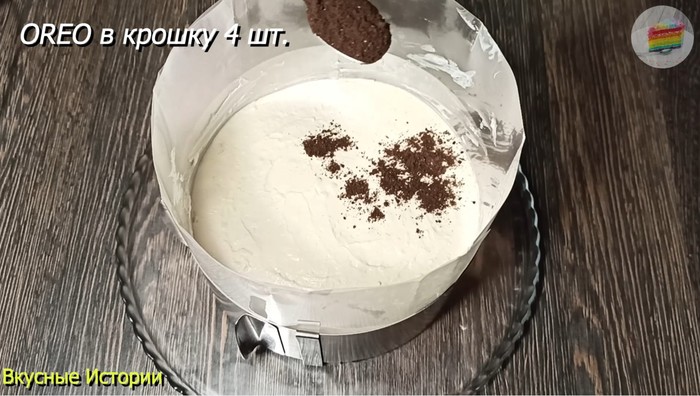 14) Измельчаю в крошку печенье OREO (4 шт) и равномерно распределяю ее на поверхности чизкейка.