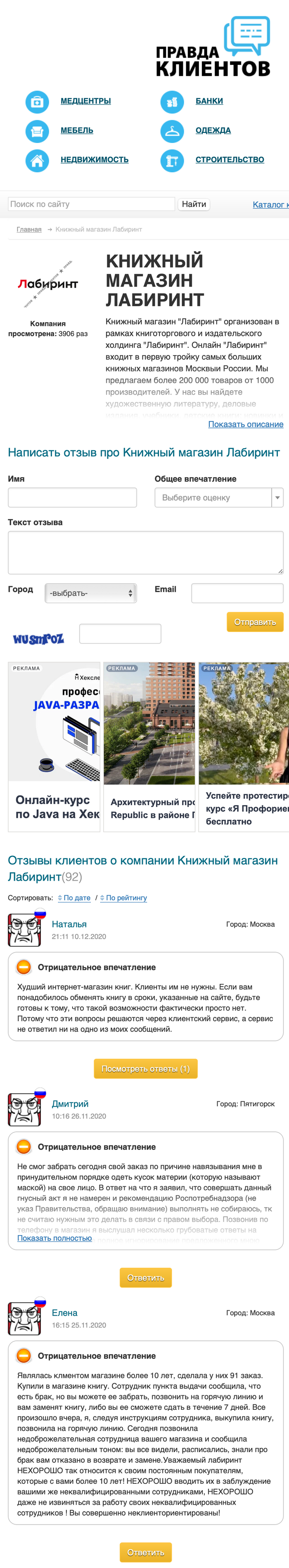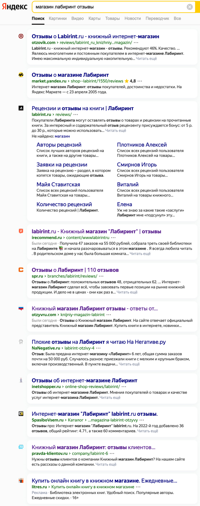 Посмотрим на то, как обстоят дела с репутацией у книжного магазина “Лабиринт”. Для этого перейдем в поисковик и сделаем запрос “лабиринт отзывы”.