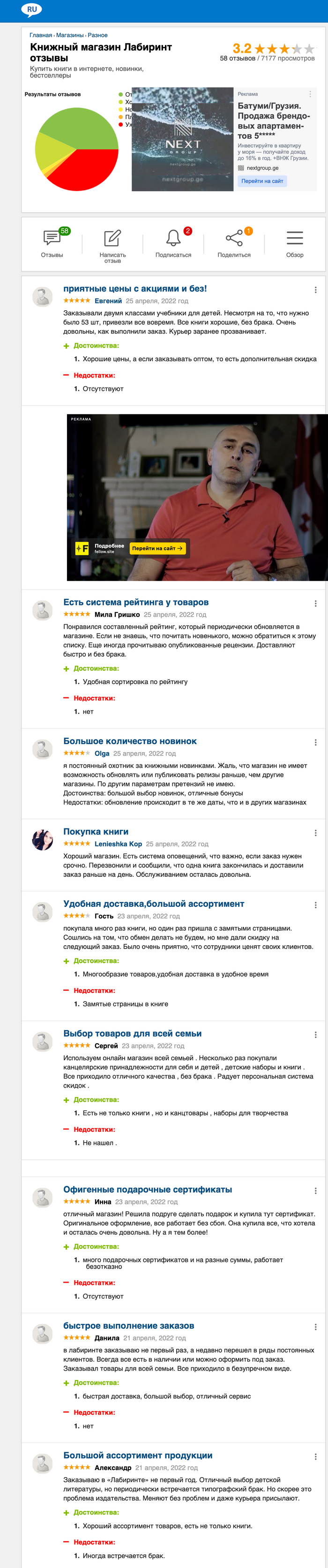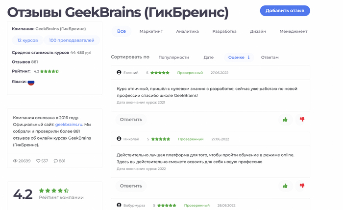 Забираясь дальше вглубь выдачи картина остается примерно на том же уровне. Средний рейтинг на карточках колеблется между 4 - 4.5. Правда есть такой момент, что некоторые ресурсы ребята уже давно забросили, так как новый контент не поступает уже 2-3 месяца. На одном из отзовиков напротив контент поступает слишком часто, порой по 2 отзыва в день.