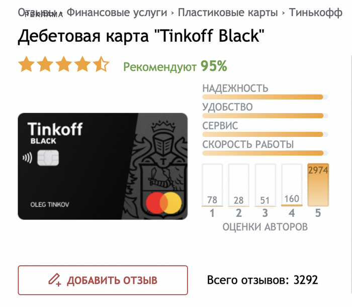 Далее давайте зайдем на отзовик и посмотрим, как обстоят дела у ребят из Тинькофф, в данном случае конкретно по продукту их дебетовой карты Блэк.
