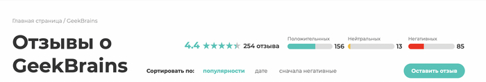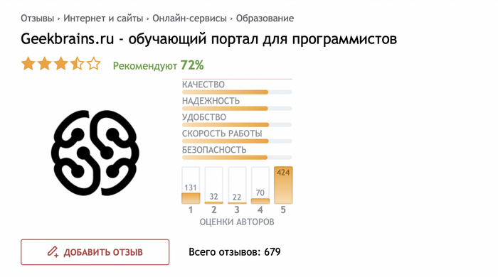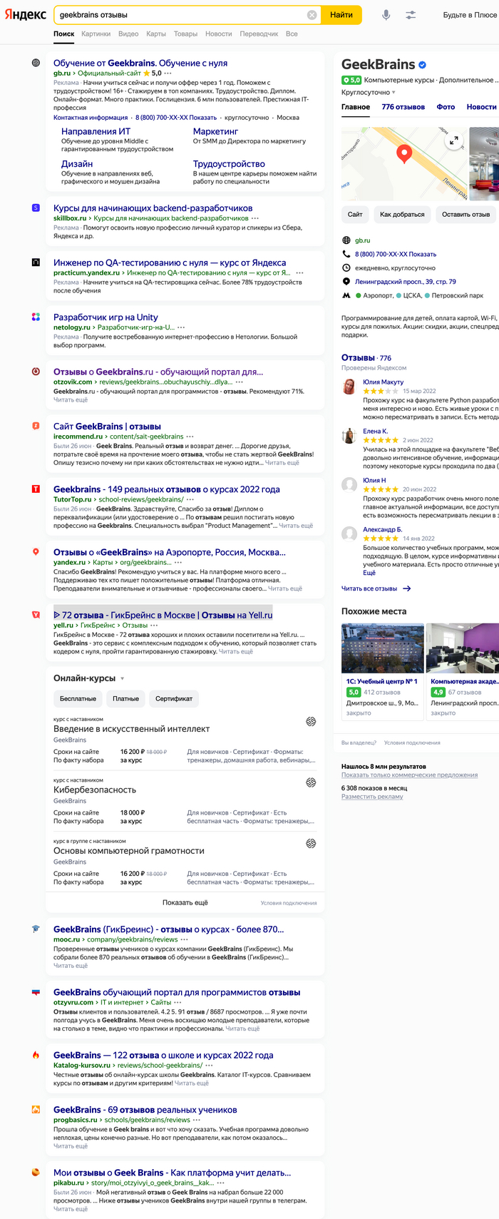 Сродни тому, как мы разбирали неудачные примеры, начнем с аналитики поисковой выдачи. В этот раз возьмем сервис с курсами GeekBrains и забьем поисковой запрос: “geekbrains отзывы”.