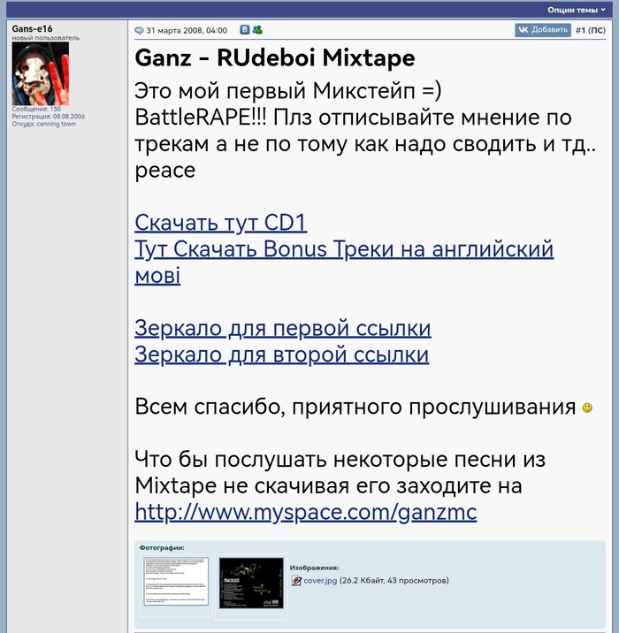 Я чекал старые треки Оксимирона и наткнулся на микстейп GANZ'а, с которым они вместе рэпчину записывали. На hip-hop.ru сказано, что таи 10 треков +2 бонусных, но в интернете я нашёл лишь 7 из них: