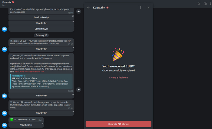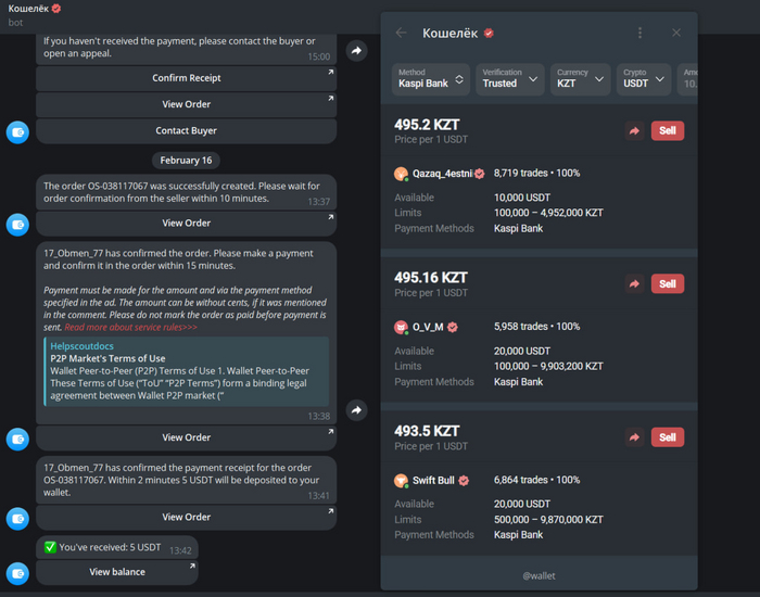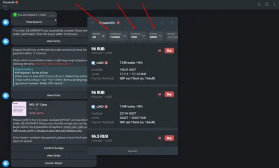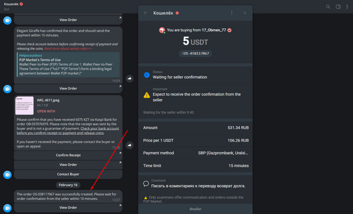 Выбираем сделку, указываем, сколько хотим USDT и нажимаем "Купить". Ждем, пока продавец примет сделку.