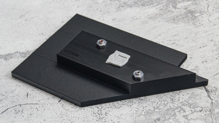 Радиатор чипсета представляет собой плоский, но довольно толстый кусок металла форму которого с натяжкой можно назвать трапециевидной. Крепится он двумя винтами, а контакт с кристаллом происходит через термопрокладку.