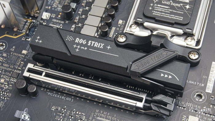 Фиксация накопителей во всех M.2-слотах безвинтовая (Q-Latch). Для фиксации нужно прижать SSD, и он зафиксируется захватом пластиковой детали. Освобождается накопитель нажатием на эту пластиковую деталь.