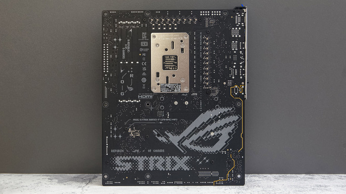 Тыльная сторона платы представляет собой открытый текстолит. Из примечательного здесь – очень крупный логотип ROG и надпись STRIX, выполненные серым цветом.