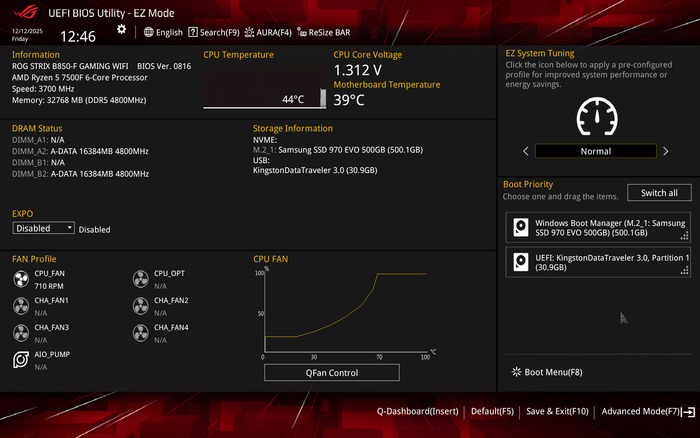 Оболочка UEFI выдержана в агрессивной черно-красной палитре — визитной карточке ROG. Как и всегда, здесь имеется два варианта отображения интерфейса: по умолчанию работает понятный упрощенный интерфейс, а клавиша F7 раскрывает весь мощный арсенал продвинутых настроек для продвинутых юзеров и энтузиастов.