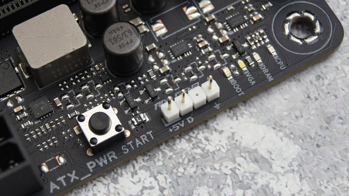В правом углу разместился индикатор POST-кодов (Q-LED). Рядом – кнопка-дублер запуска системы. Это особенно удобно, если материнская плата является частью открытого стенда.