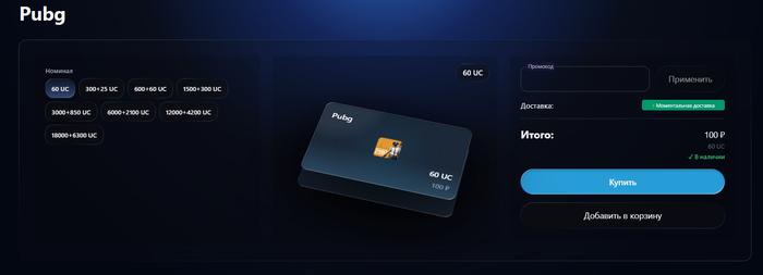 Перейдите на Code-top.shop, откройте раздел PUBG Mobile и выберите нужный номинал монет. В карточке товара указано точное количество UC, которое вы получите после активации.