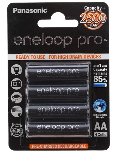 Высокотехнологичные аккумуляторы PANASONIC Eneloop PRO. Отличительной характеристикой аккумуляторов является то, что они могут быть перезаряжены до пятисот раз, что является беспрецедентной рабочей характеристикой. Также они устойчивы к саморазряду, который после одного года составит 15%. Емкость аккумуляторов составляет 2500 мАч, форм-фактор аккумуляторов – АА. Ссылка на них