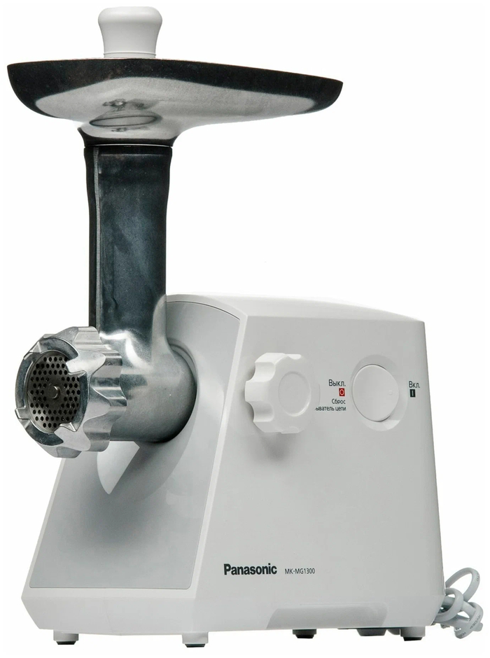 Мясорубка Panasonic выполнена в белом цвете и оснащена пластиковым корпусом и металлическим лотком для удобной загрузки мяса в емкость устройства. Вес оборудования равен 3,2 кг, а габариты составляют 16,6x38,6x31 см, что позволяет использовать посуду с высотой до 11 см. ссылка на неё