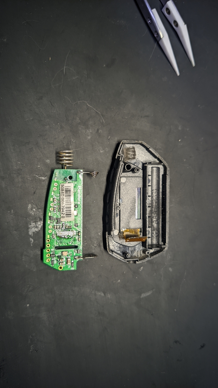 Сам брелок скручен двумя болтами - один потайной, под резинкой. Выкручиваем болты, и аккуратно разделяем корпус на две части: