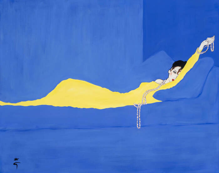 René Gruau (1909-2004). En robe jaune sur canapé bleu