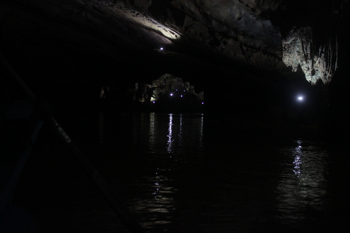 Лодка плыла в две группы и когда гид нас довез до берега, обратно он поплыл один, пожелав нам счастливо оставаться с ехидной ухмылкой на лице. Впрочем, вскоре он вернулся, и мы продолжили путь. Немного пройдя, мы увидели еще одно чудо природы. Все стены пещеры, просто блестели! Это выглядело как будто их обильно обсыпали блестками и в свете фонарей это было просто восхитительно! Насколько я понял, это известняк, но уверенно заявлять не буду.