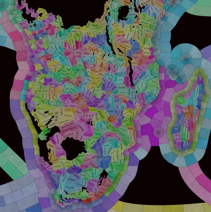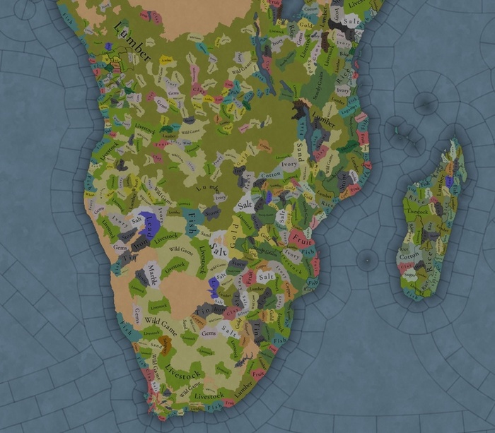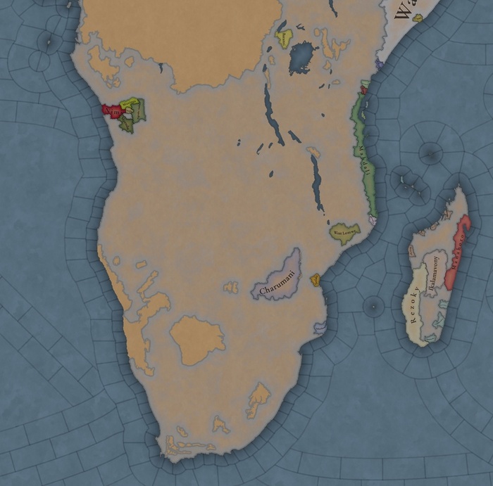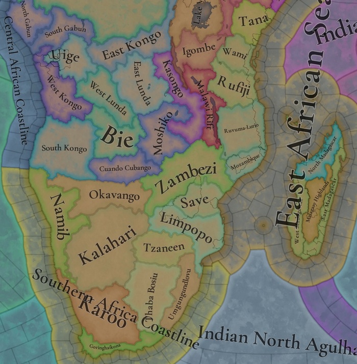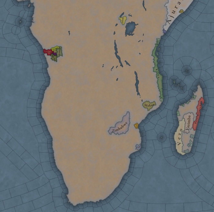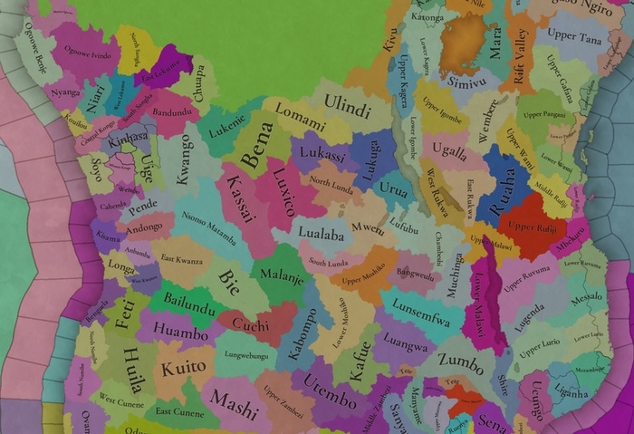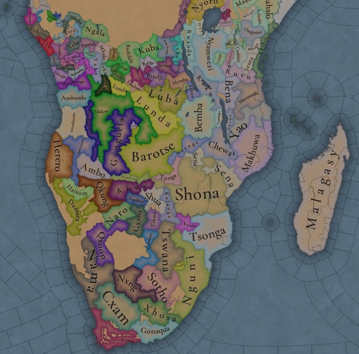 На современных картах есть «центры» стран, примерно по одному на регион. В Центральной Африке есть следующие государства: Мбанза Мбата, Мбанза Конго, Вуунгу, Нсуди, Момбоарес и Мпемба; некоторые из них, возглавляемые Мбанза Конго, исторически объединятся и создадут Королевство Конго, которое будет самым значимым и даст название всему региону. Вокруг них расположились и другие народы, такие как сойо, овимбунду, чокве, лунда, луба, куба и лега. Тем временем в Восточной Африке из Килвы Кисивани возник султанат, который распространился по всему побережью и стал ключевой торговой державой в Индийском океане. На юге находится Великое Зимбабве - государство, созданное народом шона вокруг одноименного поселения. Вокруг них, а также еще южнее, расположено множество сообществ ПОПов. И, наконец, на Мадагаскаре живет народ малагасийцев, который объединен в несколько полисов по всему острову. Напоследок: как обычно, пожалуйста, воспринимайте размеры и расположение сообществ ПОПов как незаконченную работу, о чем мы уже говорили. Нам ещё многое предстоит переделать.