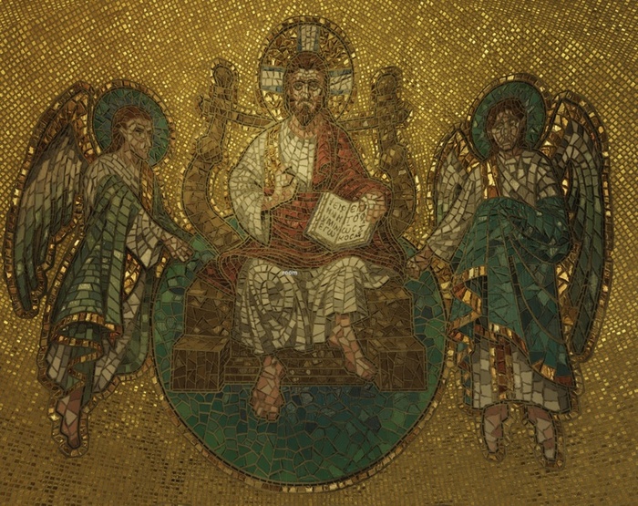 Что касается сюжета, то, как мы знали из описаний того времени, над апсидой возвышался Христос на троне-лире. Мы также знали, что там были изображены императоры, святые и ангелы. А также зелёные поля и цветы.