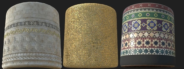Для отделки и узоров, которые обрамляют архитектуру и составляют более геометрические части мозаики, мы использовали различные варианты отделки и материалы.