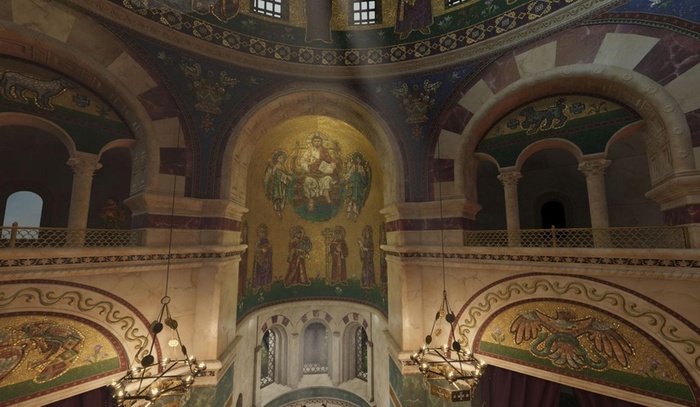 Мы также не могли не создать уникальный фон для собора Святой Софии. Сначала мы хотели «разместить камеру» у балкона. Таким образом, мы хотели показать размер сооружения, но наши дизайнеры сказали, что балкон обычно использовался только женщинами, поэтому мы выбрали другую композицию.