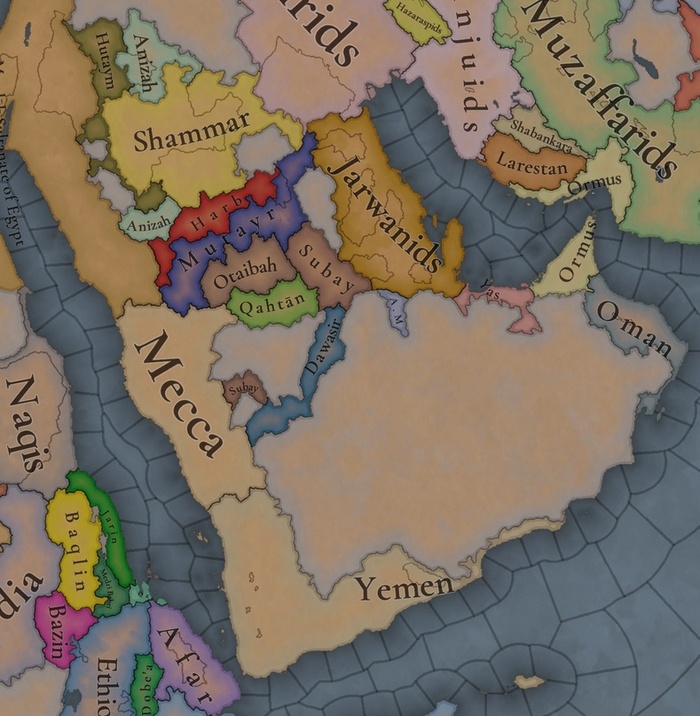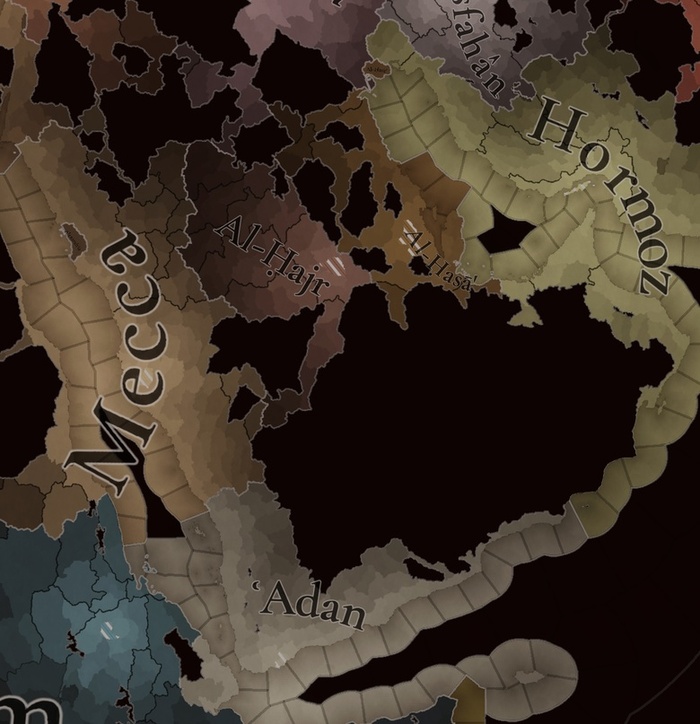 Поэтому мы решили, что для моделирования ситуации на Аравийском полуострове лучше всего подходит разделение на те страны, которые являются монархиями (Мекка, Йемен, Оман, Ормус и Джарваниды), и те, которые являются племенными (остальные). Интересной особенностью последних является то, что на их землях будет много соплеменников, что делает родовое поместье наиболее важным для управления. В качестве заключительного замечания, я бы хотел, чтобы вы поняли, что это наша интерпретация симуляции игры, хотя она может быть и не единственной (как это произошло с дискуссиями о том, какие европейские страны должны быть децентрализованы на несколько субъектов, а какие нет). Хорошей новостью в связи с этим является то, что мы, как обычно, будем открыты для обратной связи и внесения изменений, а также то, что эту настройку можно легко изменить с помощью сценария игры, что сделает ее полностью модифицируемой после выхода игры; таким образом, потенциально могут появиться моды, в которых внутренняя Аравия будет покрыта сообществами попов вместо стран, населенных племенами, если вам нравится / не нравится наша интерпретация или просто предпочитаете, чтобы она была другой.