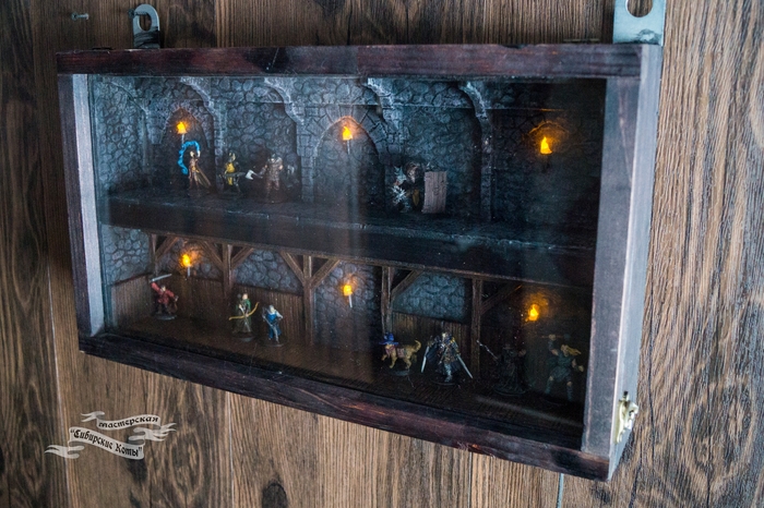 Тут внезапно у нас родилась такая антуражная полочка-шкафчик для хранения миниатюр. Подсветка работает от сети.