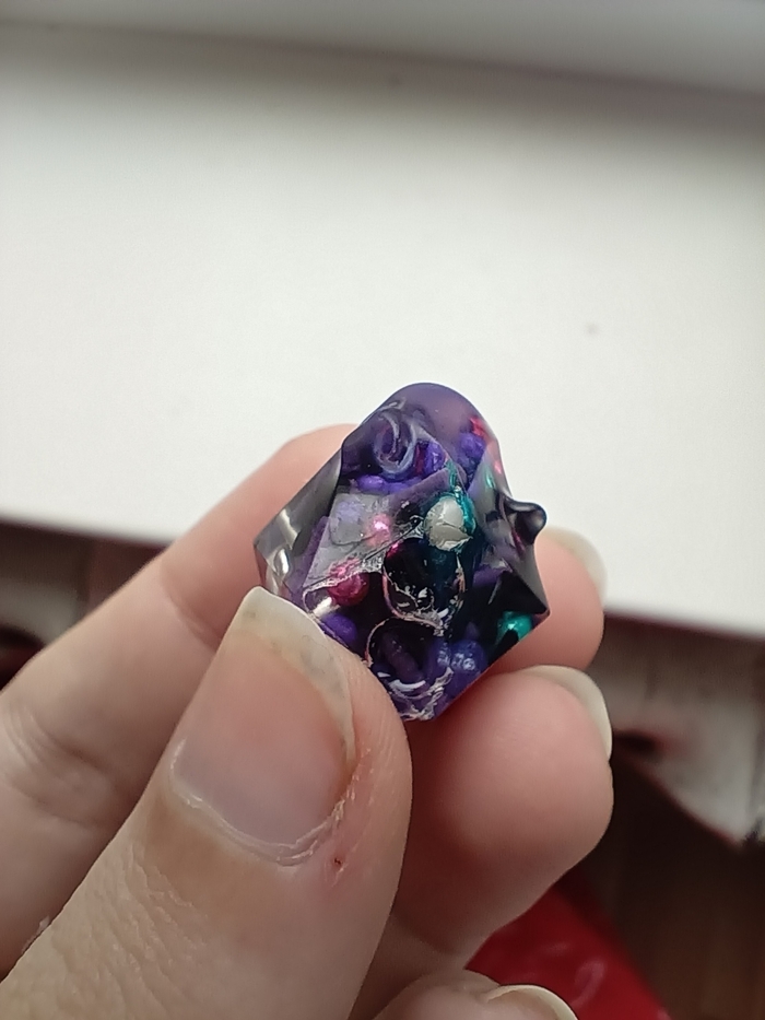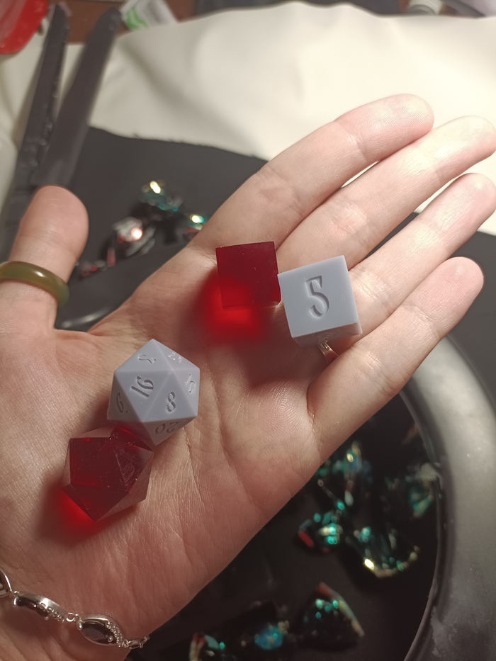 В моём случае такие болванки были нужны для перестраховки. Дело в том, что вкусняшки внутри я старалась разложить очень равномерно, чтобы не осталось свободного места, чтобы дайсы действительно выглядели как настоящие конфетки. И если бы я закладывала их сразу в обычный дайс, а не в болванку, то при снятии верхнего слоя эпоксидной смолы при шлифовке какая-нибудь особо близко прилегающая вкусняшка могла могла оставить на дайсе дырку, что не очень хорошо :(
