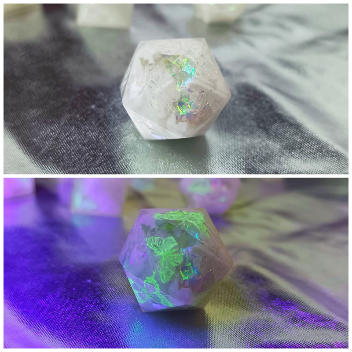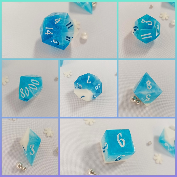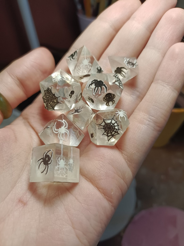Болванки - это фигурки, по форме полностью повторяющие дайс, но меньше на 1,5-2 мм и без цифр. Обычно их используют в тех случаях, когда хотят что-то нарисовать на дайсе или что-то налепить на дайс (наклейки на ногти, например, как я делала в сетах Spring Blossom или Doodles - фото с ними лежат в предыдущих постах), но сделать это так, чтобы при эксплуатации дайса изображение не пострадало. В таком случае сначало заливают болванку, разрисовывают или обклеивают ее, а потом уже эту болванку опускают в обычную форму дайса и заливают смолой. Таким образом между изображением и поверхностью дайса образовывается защитный слой смолы.