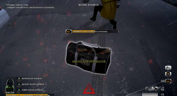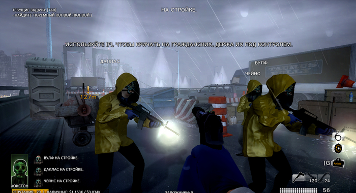 Ещё важно помнить, что на уровне есть обычные гражданские. Их нужно уложить на пол и используя специальные стяжки брать в заложники. Для чего это нужно? Во-первых если вашего "бота" или товарища возьмут копы в плен, то есть возможность обменять гражданского. Во-вторых, можно задержать копов, так как они вместо убийства вас, будут искать способ освободить заложников, тем самым давая время на составление нового плана.