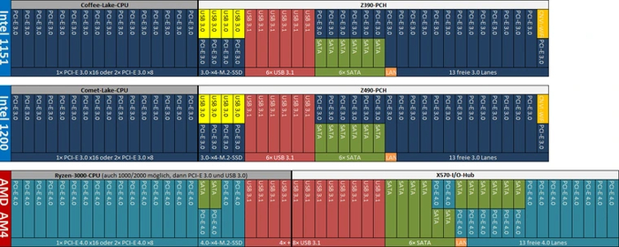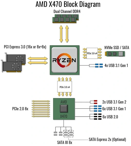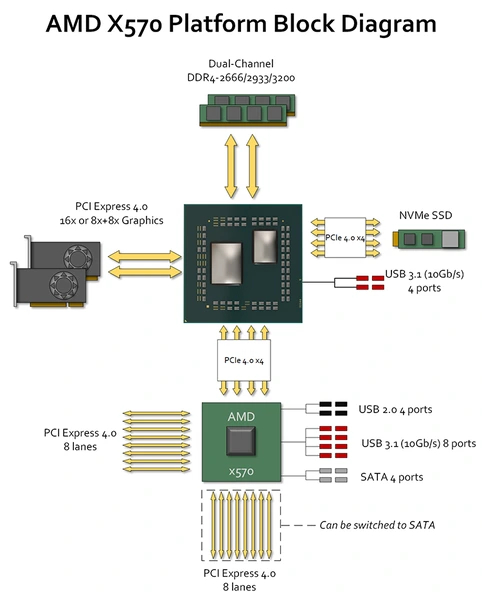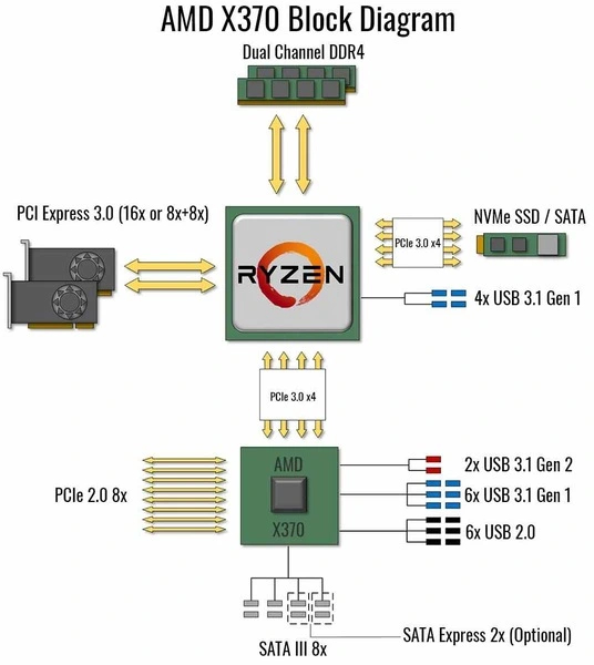 Такое устройство имеют платформы Intel, процессоры которой для коммутации с большинством устройств полагаются на возможности чипсета. Платформы AMD в этом плане немного отличаются, так как процессоры семейства Ryzen — это системы на чипе (SoC), которые кроме видеокарты и NVME SSD имеют прямое подключение к некоторому количеству портов USB, SATA и звуковому кодеку.