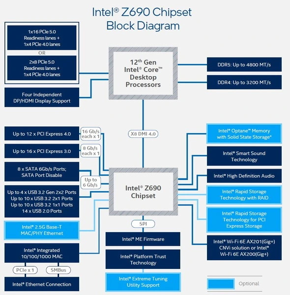 Революция в этот сегмент пришла с сокетом LGA1700, процессорами 12 поколения и новыми платами 600 серии для них. Появилось сразу два нововведения: линии для графики стали поддерживать PCI-E 5.0, линии чипсета — PCI-E 4.0. Выделенный канал для NVME SSD остался неизменным, зато линк связи с чипсетом в очередной раз ускорился в два раза: у Z690 и H670 его перевели на режим 4.0 x8, у B660 и H610 — на 4.0 x4.