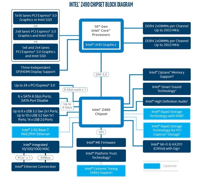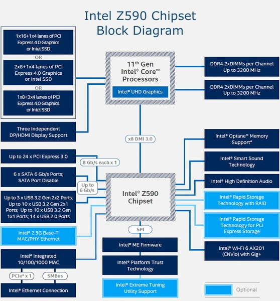 11 поколение процессоров и 500 серия чипсетов принесли поддержку PCI-E 4.0. Помимо слота нового поколения с 16 линиями для видеокарты появился и выделенный канал с 4 линиями той же версии для NVME SSD. Линк связи с чипсетом расширен до DMI 3.0 x8, но только в Z590 и H570. У первого 24 линии PCI-E, у второго — 20. Средний B560 и младший H510 остались на DMI 3.0 x4. Линий у них 12 и 6 соответственно.