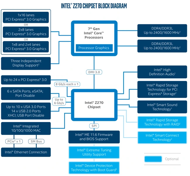 Увидевшие свет процессоры 7 поколения в этом плане изменений не получили, а вот возможности чипсетов для них немного расширились. У Z270 стало 24 линии, у H270 — 20, у B250 — 12.