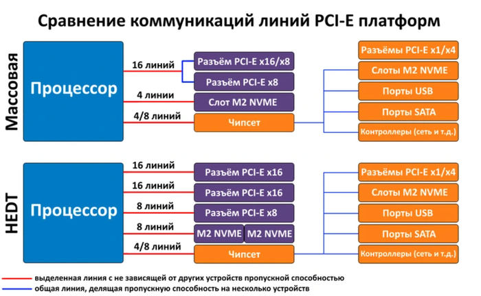 Особняком стоят HEDT-платформы обоих вендоров. В общем плане они не отличаются от массовых, но могут предложить пользователю до 64 свободных линий PCI-E напрямую от процессора. Эти линии можно гибко конфигурировать для видеокарт, слотов M2 NVME и прочей скоростной периферии.